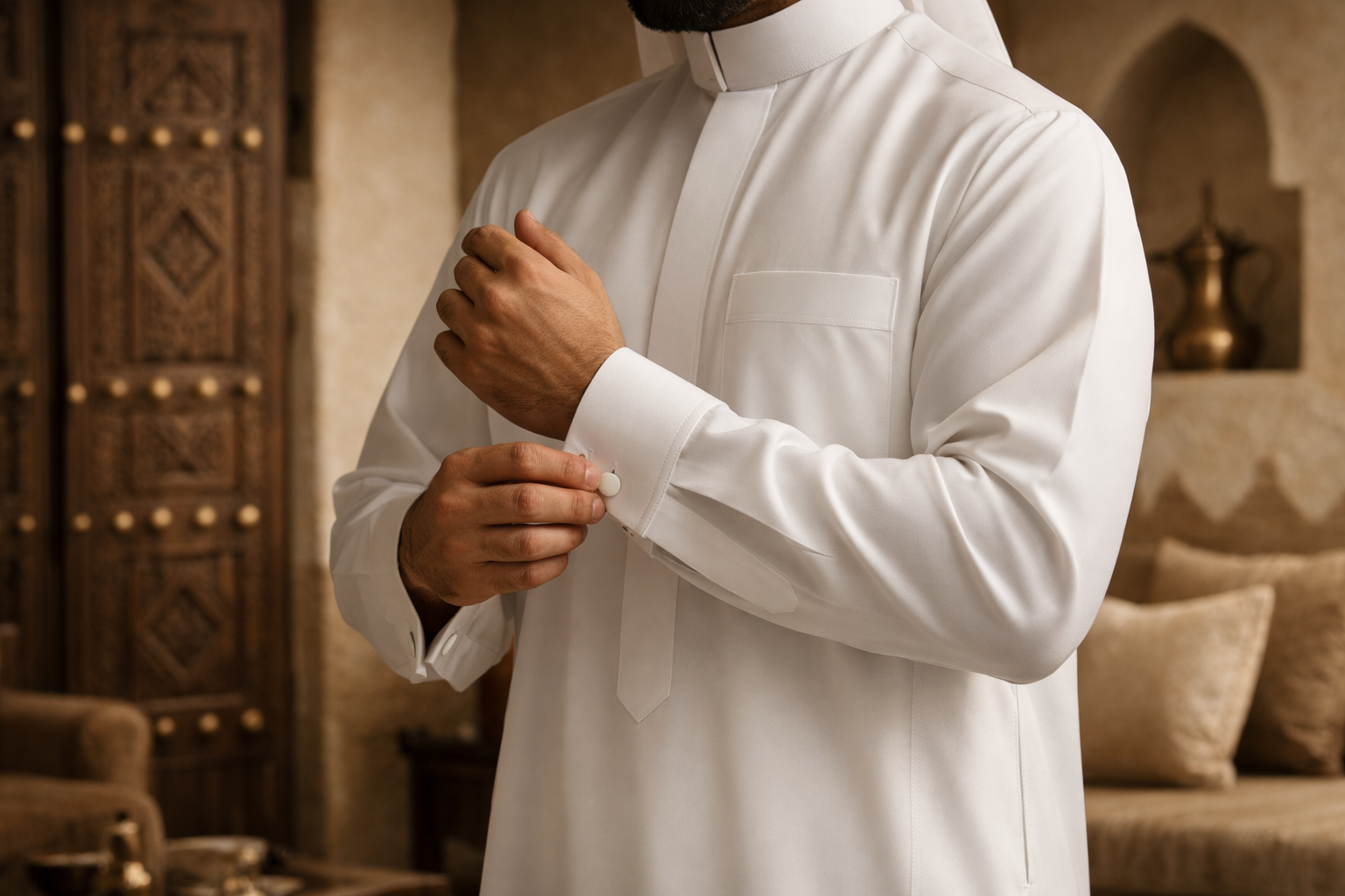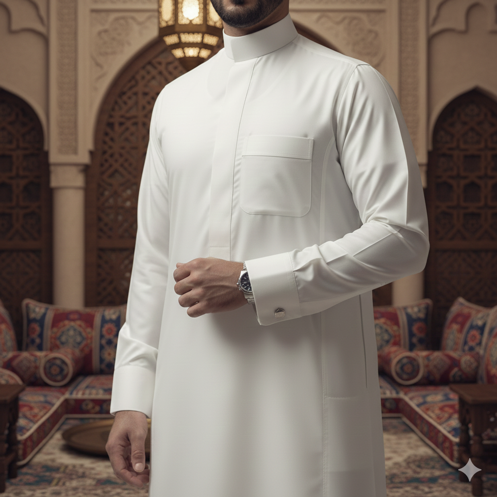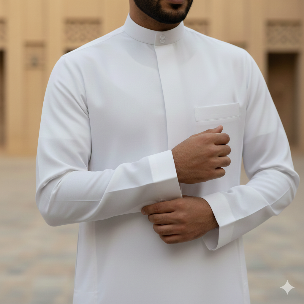 Your thobe is custom-tailored exclusively for you — a meticulous process that takes approximately 4–5 hours, ensuring exceptional craftsmanship and comfort.